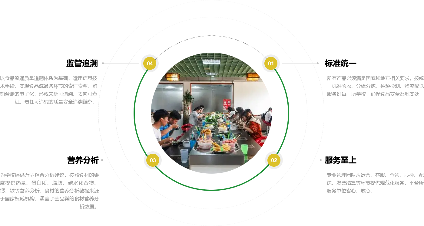 AYX愛(ài)游戲校園營(yíng)養餐聚焦中小學(xué),著(zhù)眼公共食堂食品安全,依托標準的運營(yíng)與嚴格的管理,以數字化食安監管平臺為核心,確保食材供應實(shí)現全溯源、全檢測, 保障食品安全,用心關(guān)愛(ài)學(xué)生每一餐。